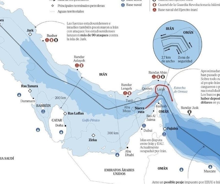 La navegación ha cambiado drásticamente: ya no se circula por el centro del canal, esa “autopista” de aguas profundas que antes garantizaba el paso. Ahora, los pocos barcos que se arriesgan lo hacen pegados a las islas de Qeshm y Larak, pero solo tras cumplir una condición económica: el depósito previo de dos millones de dólares en yuanes o Bitcoin.