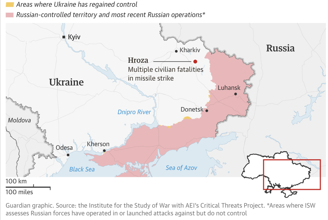 La muerte de 51 civiles en el ataque contra un centro de reparto de alimentos en Groza ha vuelto a sembrar el terror en una zona que había sido devastada ya por la invasión rusa, informan desde Ucrania Luke Harding y Pjotr Sauer en The Guardian. La estrategia de golpear contra las “colas del pan” es ya algo habitual en el historial bélico de Vladimir Putin. Desde Granada, donde participó en el cónclave de líderes de la UE, Volodimir Zelenski condenó el ataque como “un crimen brutal” y “una agresión genocida.”