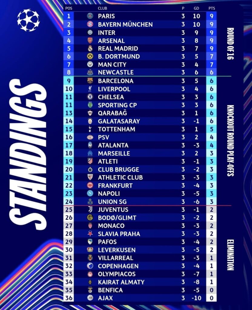 | PSG vs. Bayern de Múnich | Este duelo en el Parque de los Príncipes es un clásico europeo reciente que enfrenta a dos de los cinco equipos que llegan con pleno de 9 puntos (3 victorias en 3 partidos). El resultado definirá quién se perfila como el mejor equipo de la fase liga. |