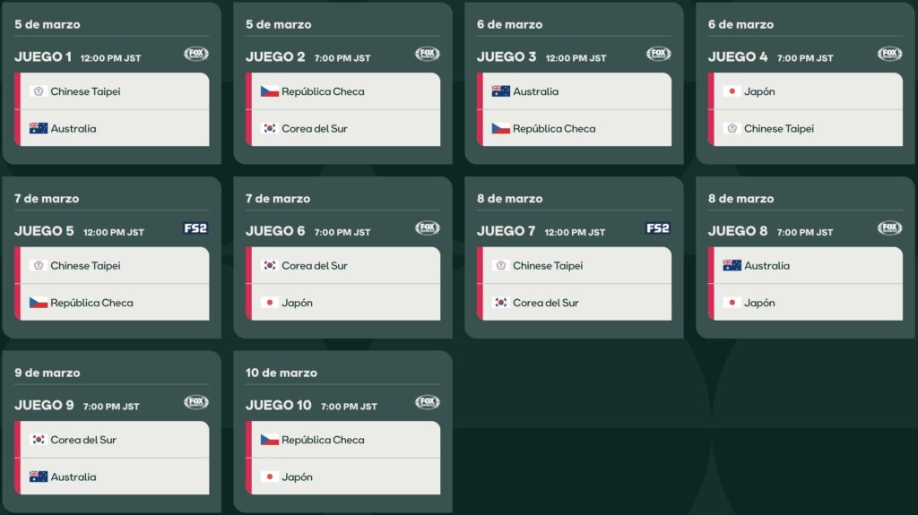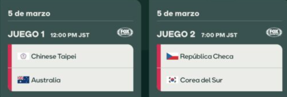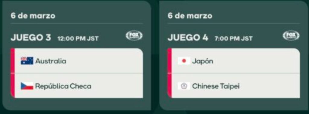 | 6 Mar | 19:00 | 🇯🇵 Japón vs 🇹🇼 China Taipéi | Plato fuerte: El campeón vs el monarca del Premier12. |
