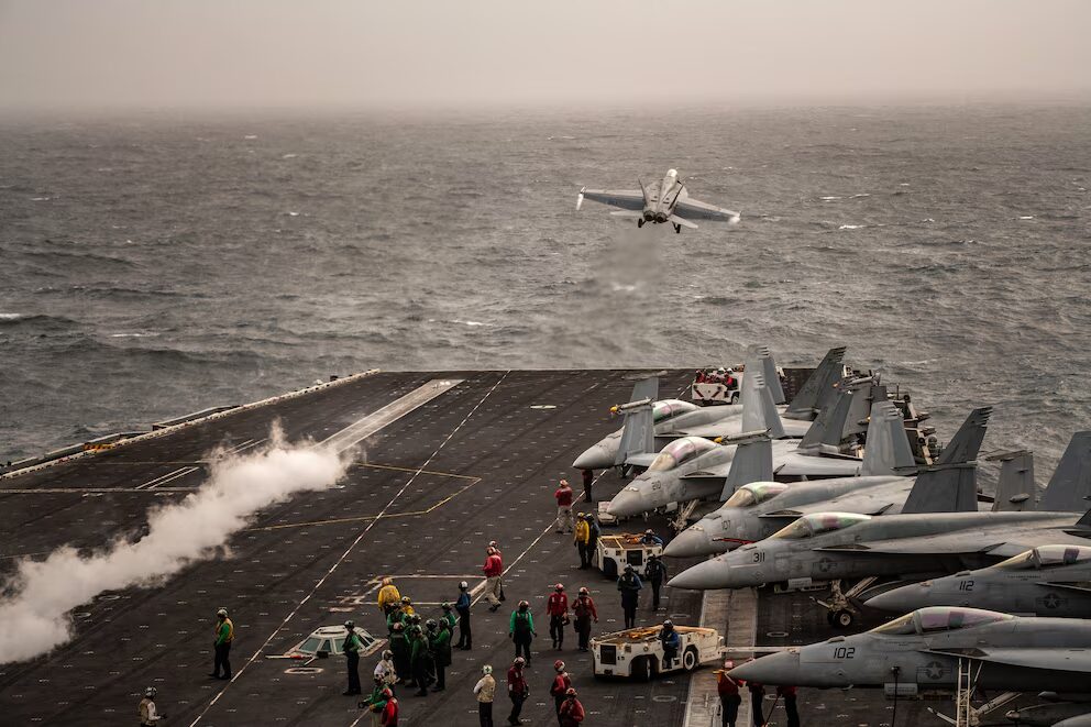 Un F/A-18 Super Hornet durante el despegue desde la cubierta de vuelo del portaaviones USS Abraham Lincoln. (Bryan Denton/The New York Times)