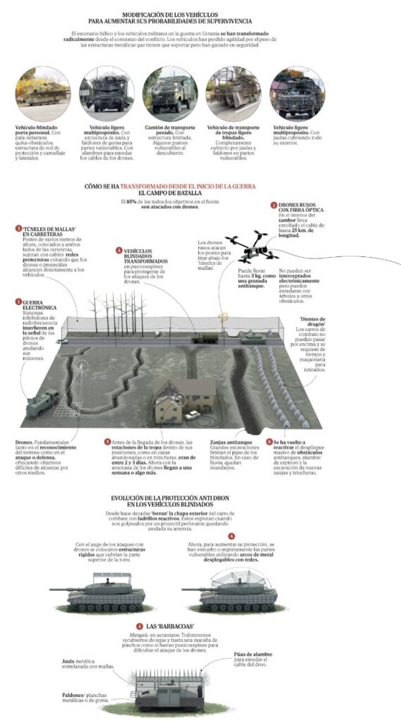 Esta proliferación es una respuesta directa a la omnipresencia del dron como arma dominante. “En aquel entonces [2014] los necesitábamos para defendernos de la metralla y ahora han regresado para protegernos de los drones. En aquellos años buscábamos proteger los lados. Ahora tenemos que protegernos la cabeza”, explica el teniente coronel Yehor ‘Kent’.
