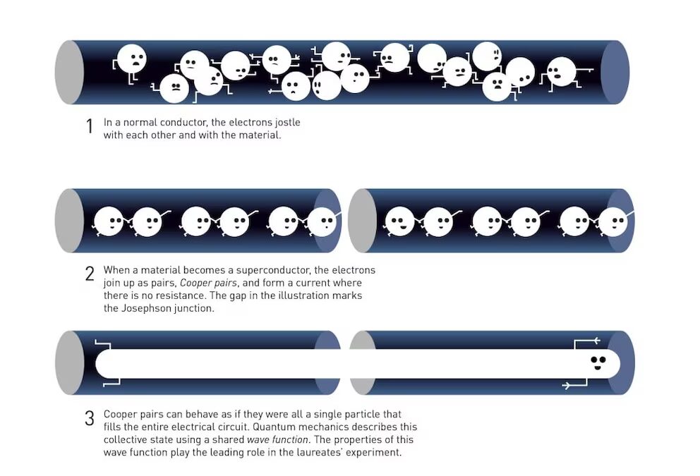En un conductor normal, los electrones chocan entre sí y con el material. Cuando un material se convierte en superconductor, los electrones se unen en pares, llamados pares de Cooper, y forman una corriente sin resistencia. El espacio en la ilustración marca la unión Josephson. Los pares de Cooper pueden comportarse como si fueran una sola partícula que llena todo el circuito eléctrico. La mecánica cuántica describe este estado colectivo utilizando una función de onda compartida. Las propiedades de esta función de onda desempeñan un papel fundamental en el experimento de los galardonados. ©Johan Jarnestad/Real Academia Sueca de Ciencias