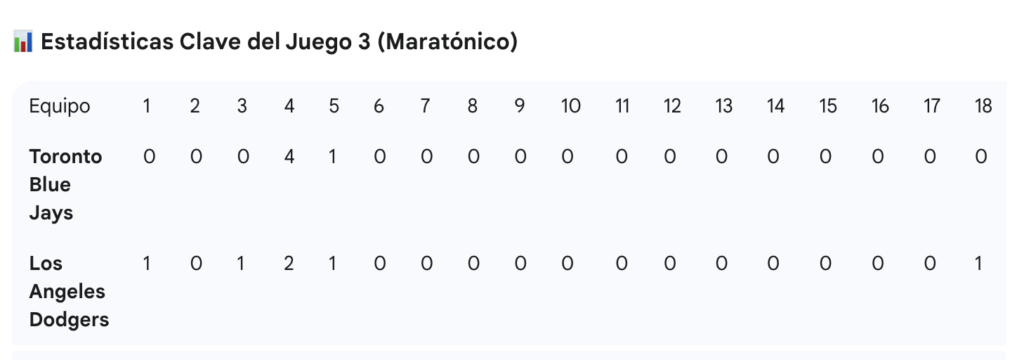 El momento culminante llegó en la parte baja de la 18ª entrada. Con el marcador aún inamovible en 5-5, Freddie Freeman tomó el bat y conectó un espectacular jonrón de walk-off (solitario), dejando a los Azulejos tendidos en el campo y desatando el delirio en Los Ángeles. Este jonrón no solo puso fin al que es el segundo juego más largo por innings en la historia de la Serie Mundial (empatando el récord de 1916 y el Juego 3 de 2018), sino que también le dio a los Dodgers una ventaja crucial de cara al resto de la serie.