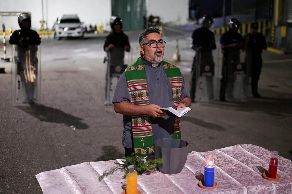 Un sacerdote reza mientras agentes de la Policía Nacional Bolivariana montan guardia, en Caracas, el pasado mes de enero.REUTERS