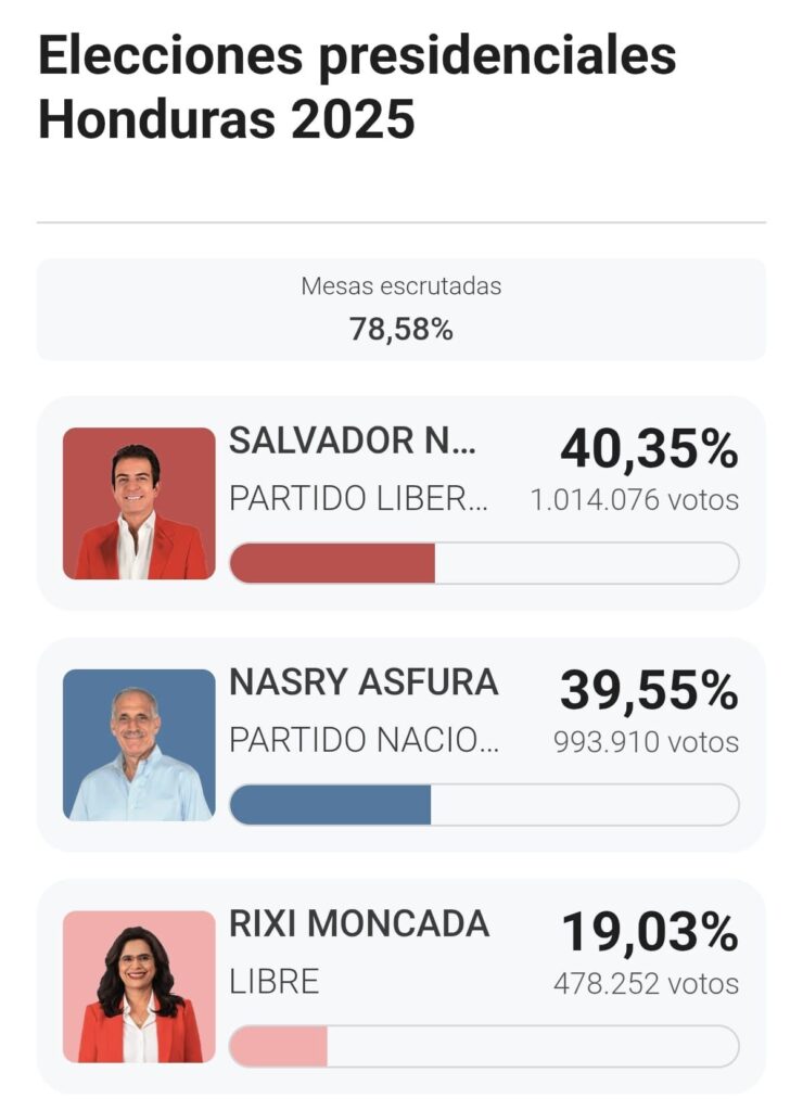 - Liderazgo Liberal: Salvador Nasralla, del Partido Liberal, ha pasado a comandar el escrutinio, superando al candidato nacionalista Nasry Asfura (conocido popularmente como “Papi a la Orden”).
