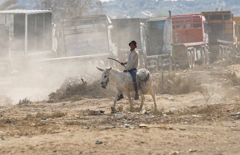 Camiones vacíos se dirigen a recoger suministros de ayuda, mientras un hombre monta un burro, en medio de un alto el fuego entre Israel y Hamas, en Khan Younis, en el sur de la Franja de Gaza, el 17 de octubre de 2025. REUTERS/Mahmoud Issa