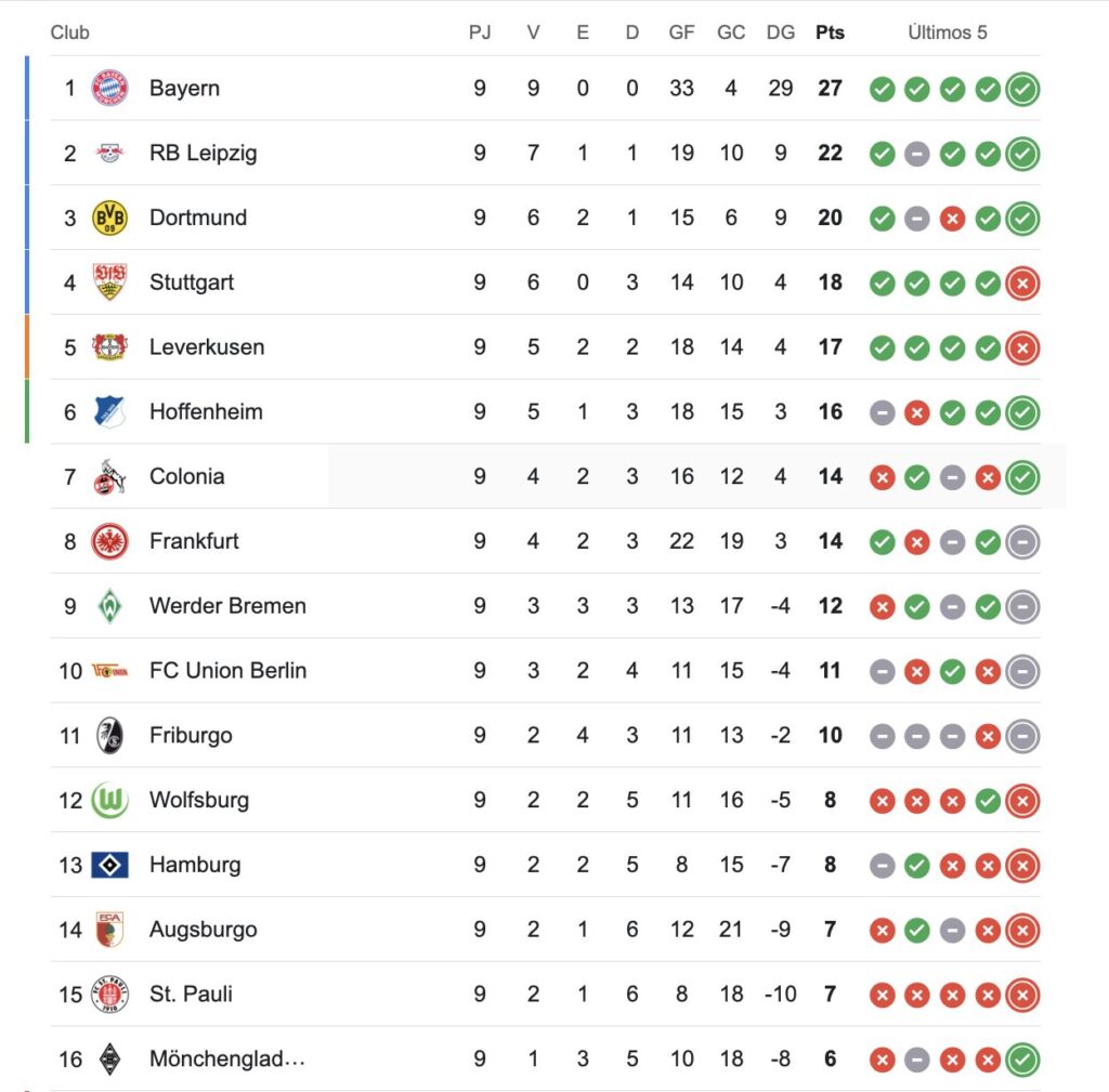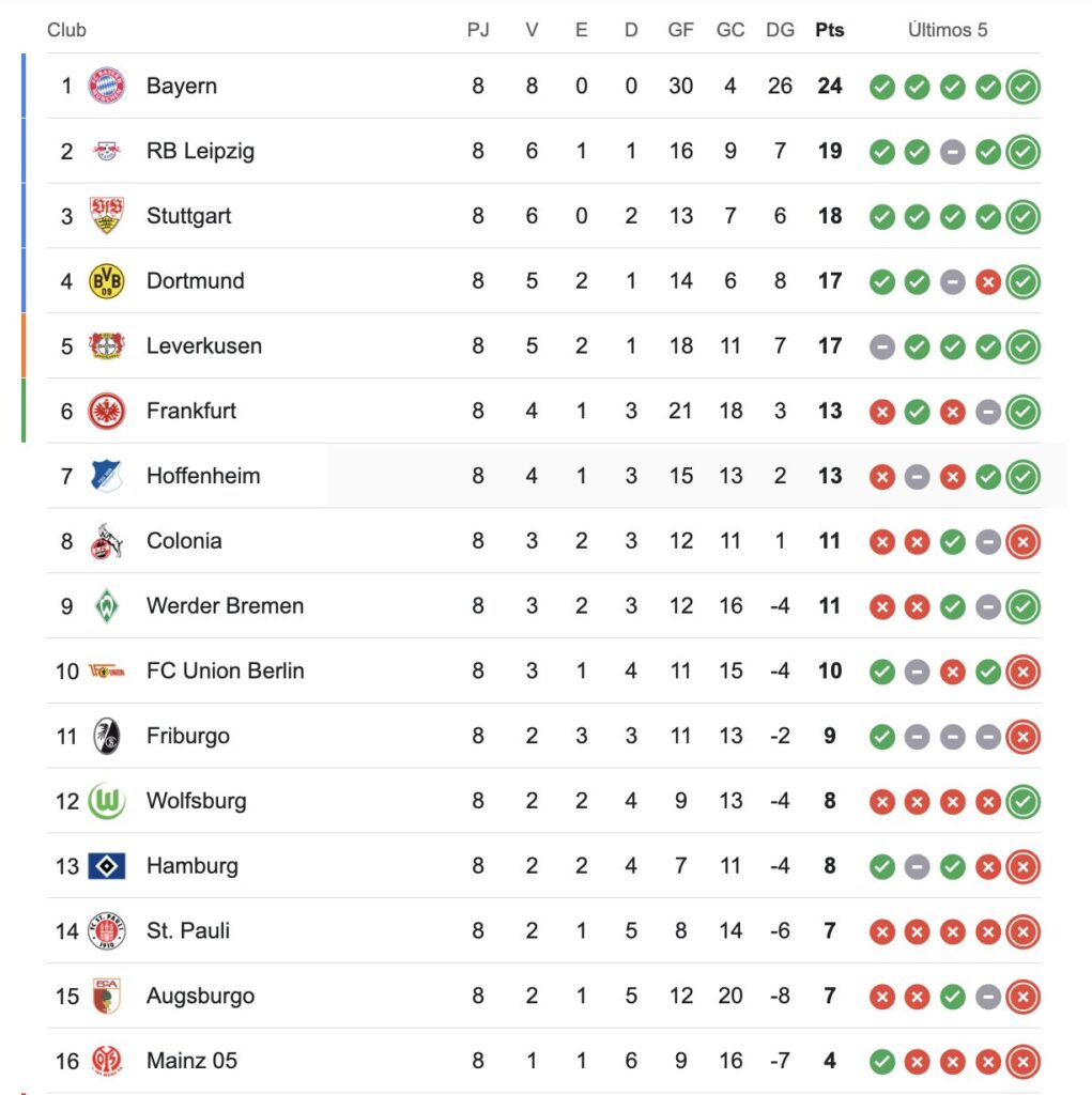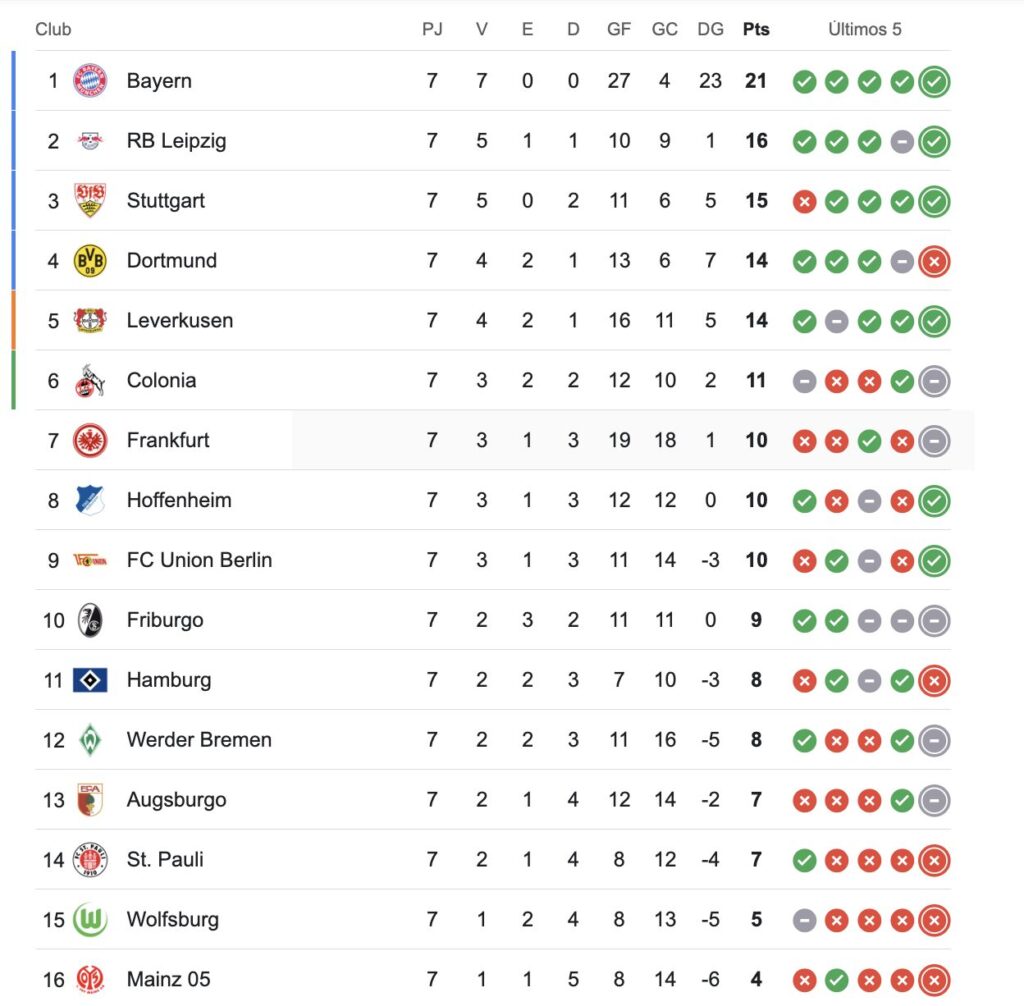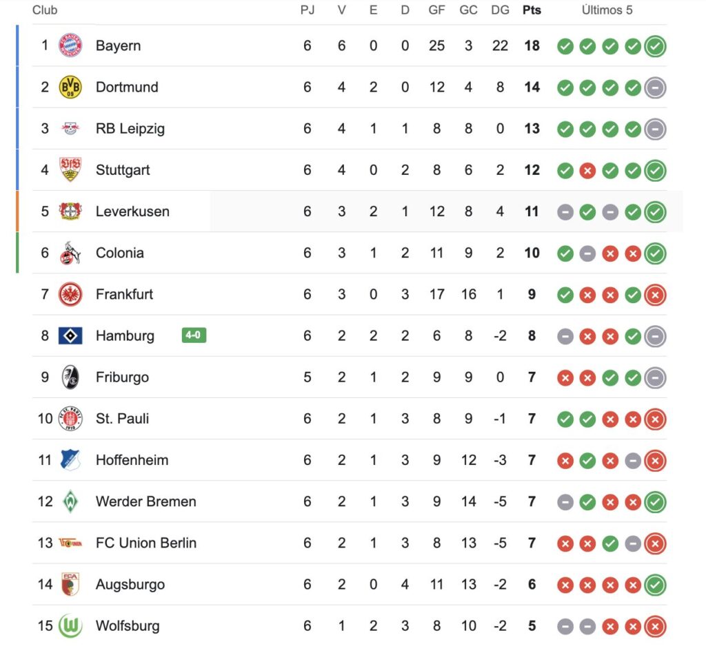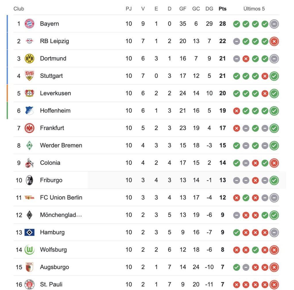 Bayer Leverkusen se mete nuevamente en la pelea. Se ubica cuarto en la bundesliga, con 20 unidades, detrás de Bayern Munich (28), Leipzig (22) y Borussia Dortmund (21)