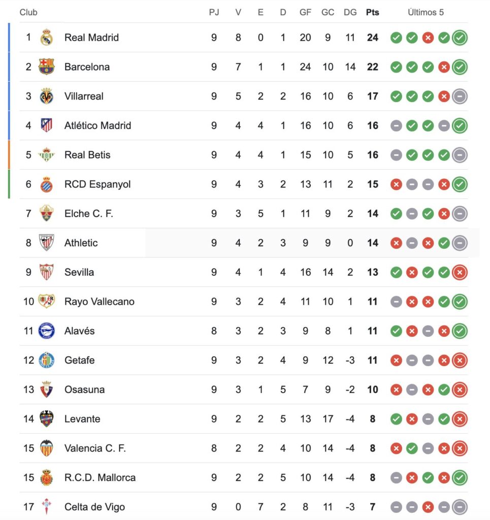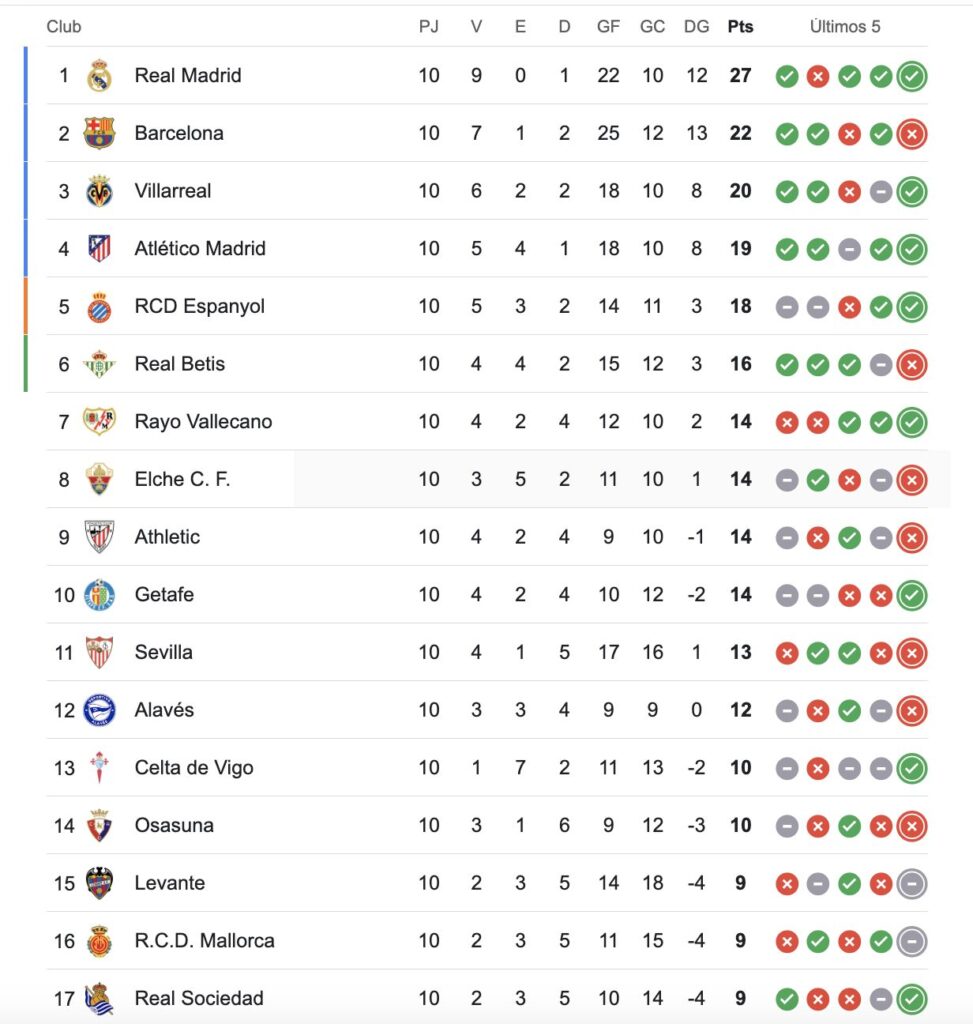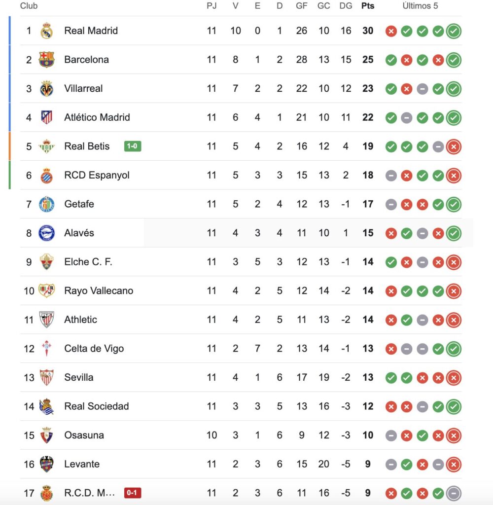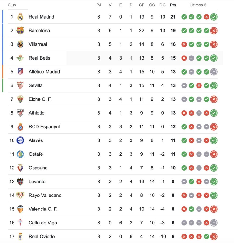 Con este abrumador resultado, Real Madrid alcanzó la línea de los 30 puntos sobre 33 posibles y se sostiene como firme líder de la competencia, sacándole 7 de ventaja a Villarreal y 8 (parcialmente) a Barcelona.