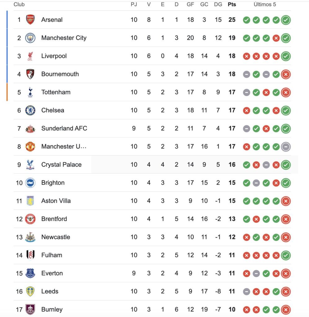 Arsenal se impuso 2 a 0 en su visita a Burnley en Turf Moor, por la fecha 10 de la Premier League 2025/2026 y continúa como el único líder del torneo inglés.