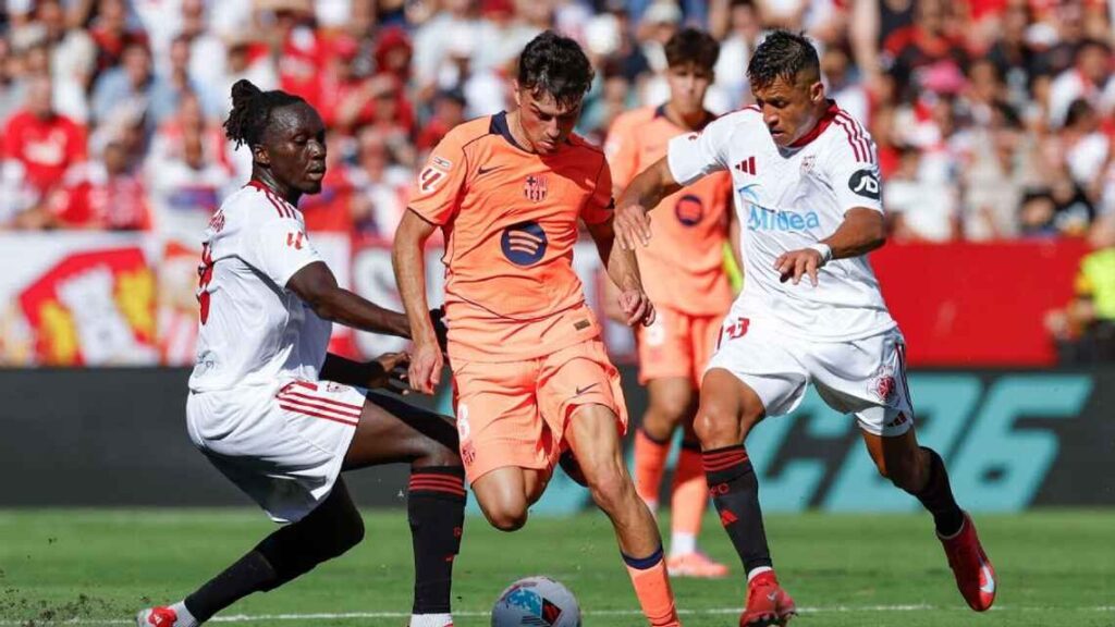 Nico González reventó el poste izquierdo del arco de Sevilla a los 36′, lo que fue la acción más peligrosa al momento.