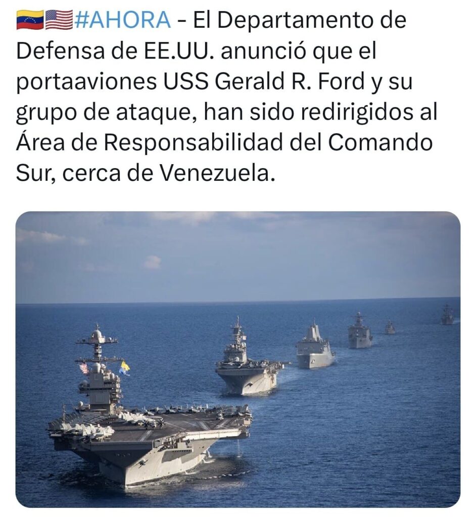 WASHINGTON D.C. – El Pentágono ha elevado drásticamente la presión militar en el Caribe. Este viernes se anunció el despliegue del grupo de ataque del portaaviones USS Gerald R. Ford, el navío más grande de la Armada de Estados Unidos, para intensificar el combate al narcotráfico en América Latina.