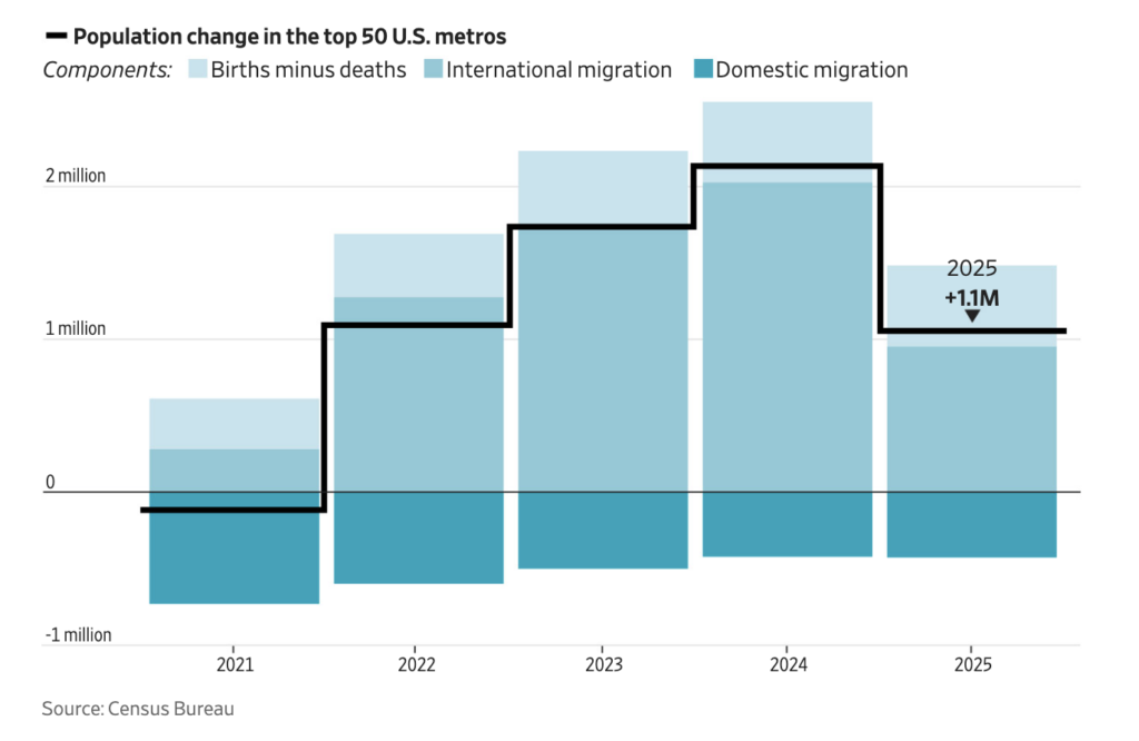 • Éxodo urbano en EE. UU.: La ofensiva migratoria de la Casa Blanca empieza a pasar factura demográfica; las grandes ciudades norteamericanas registran sus primeras caídas de población en décadas ante el temor y las salidas forzosas. Los Ángeles, San Diego y Miami registran una caída histórica de población tras la campaña de deportaciones y restricciones de la Administración Trump. Según revela The Wall Street Journal a partir de datos del censo, este “declive” urbano amenaza con provocar un impacto económico profundo debido a la pérdida de mano de obra y consumo en los principales motores del país.