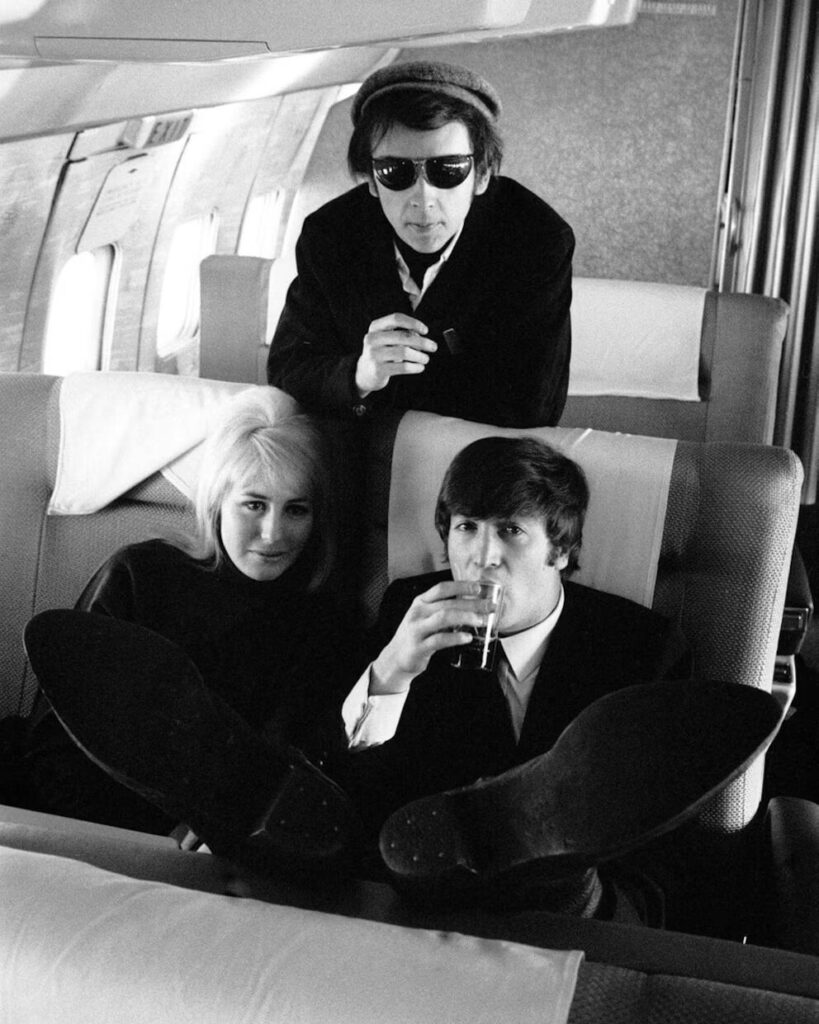 Junto a John Lennon en un avión. Tiempo después produciría sus primeros discos como solista