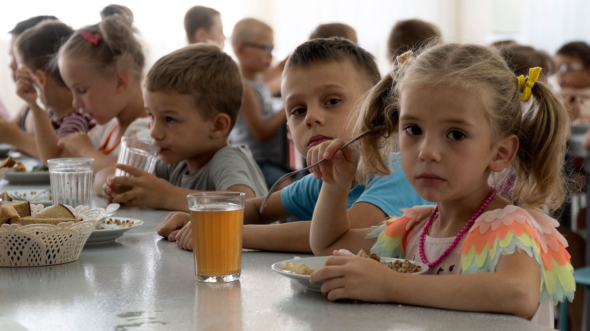 Niños de un orfanato en la región de Donetsk, comen en un campamento en Zolotaya Kosa, el asentamiento en el Mar de Azov, región de Rostov, suroeste de Rusia. (Foto AP)